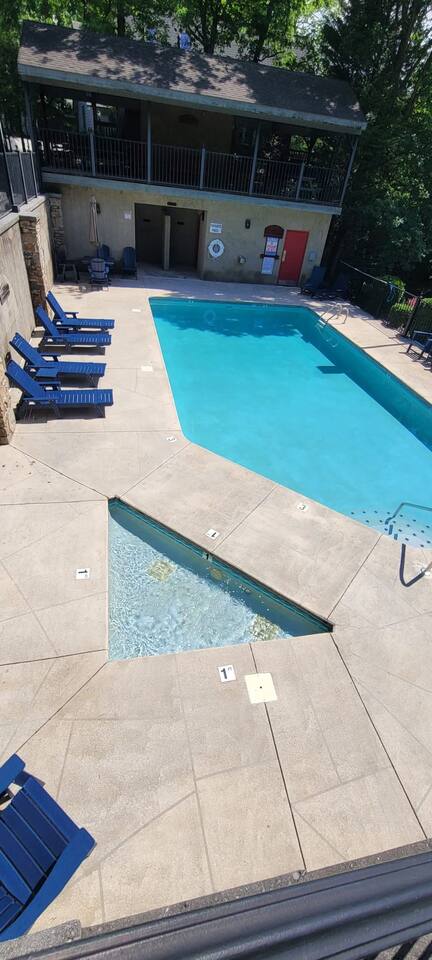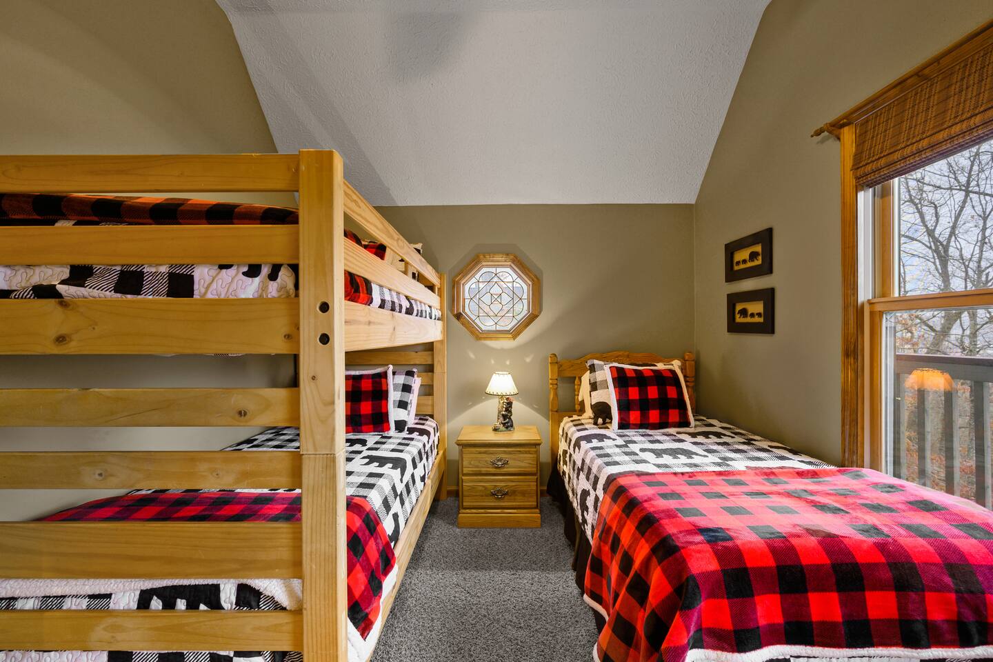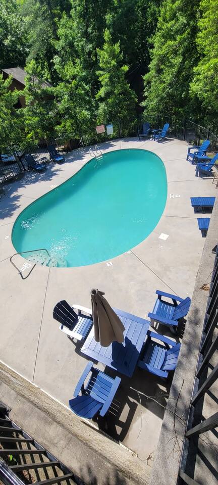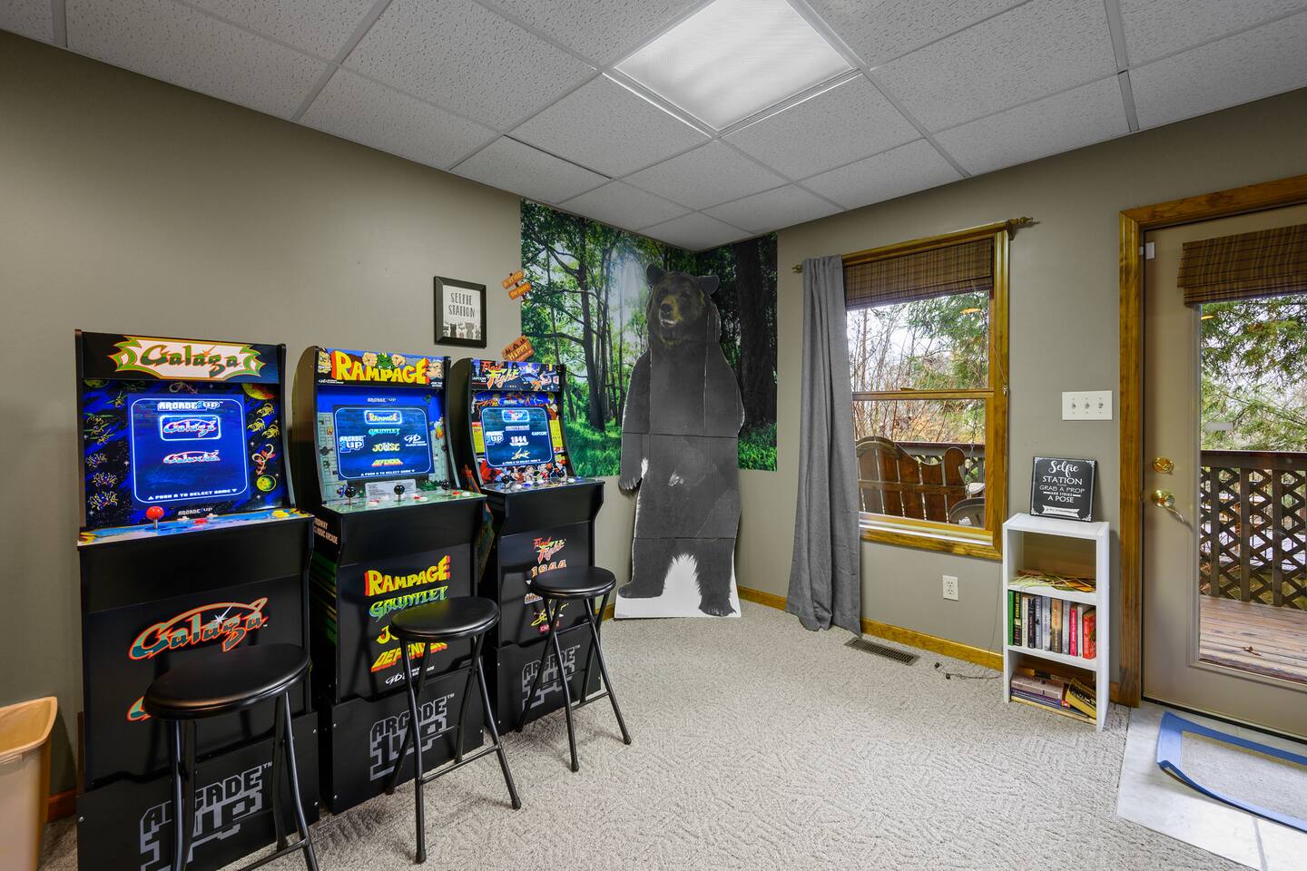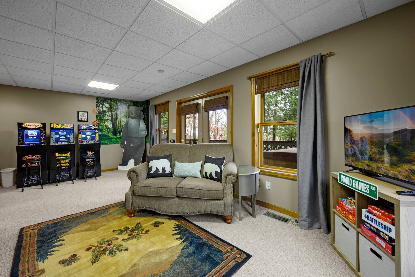 New Smart TV’s in 3 of the 4 Bedrooms Master Bedroom: King Bed Bedroom 2: Queen Bed Bedroom 3 (Bunk Room): Twin-over- Twin Bunk Bed and Single Twin Bed Bedroom 4: Queen Bed We also provide a twin trundle bed and pack and play. Arrive at your cabin and take in the beauty of the surrounding trees and gorgeous pool just off the back of the house. Step inside to admire the bear-themed décor. Cathedral ceilings, long-view windows and open layout, make the place bright and airy so you can easily stay connected with your loved ones while enjoying the surrounding scenery! Gather in the living room on the leather chairs which sits in front of the gas stone fireplace, choose a movie to play for the group on the flat-screen smart TV equipped to access Netflix, Hulu, Disney+, or Amazon prime account. For more entertainment, try to beat the high score on one of our three arcades! Stay Connected with your friends and family by snapping a pictures throughout your stay. Tag us on social media to receive discounts on your stay. Hungry? Make your way into the fully equipped kitchen, featuring granite countertops with new appliances, and prepare a delicious home-cooked meal for your friends and family. Savor your meals from the charming dining room table and share stories of the day’s adventures. We even have a booster seat for children and camping themed dishes for kids. After you’ve cleared the dishes, enjoy some fresh air and sip a nightcap from the hand crafted wooden love seat porch swing on the deck while keeping an eye out for wildlife. Before calling it a night, soothe your muscles in the hot tub so you aren’t sore for the next day’s activities. As the day comes to an end, retreat to one of the 4 themed bedrooms which all feature custom sheets and comforters for a good night’s sleep. Additional features: • High speed Internet • Large deck area • Private Hot tub • Game area • Washer and dryer • Clean towels and bed linens • Flat driveway large enough for 3 cars