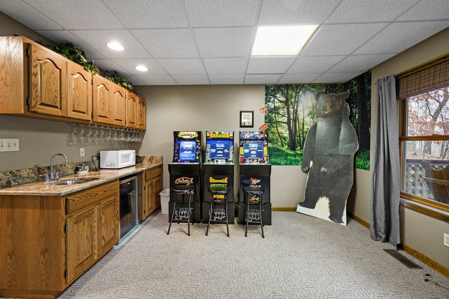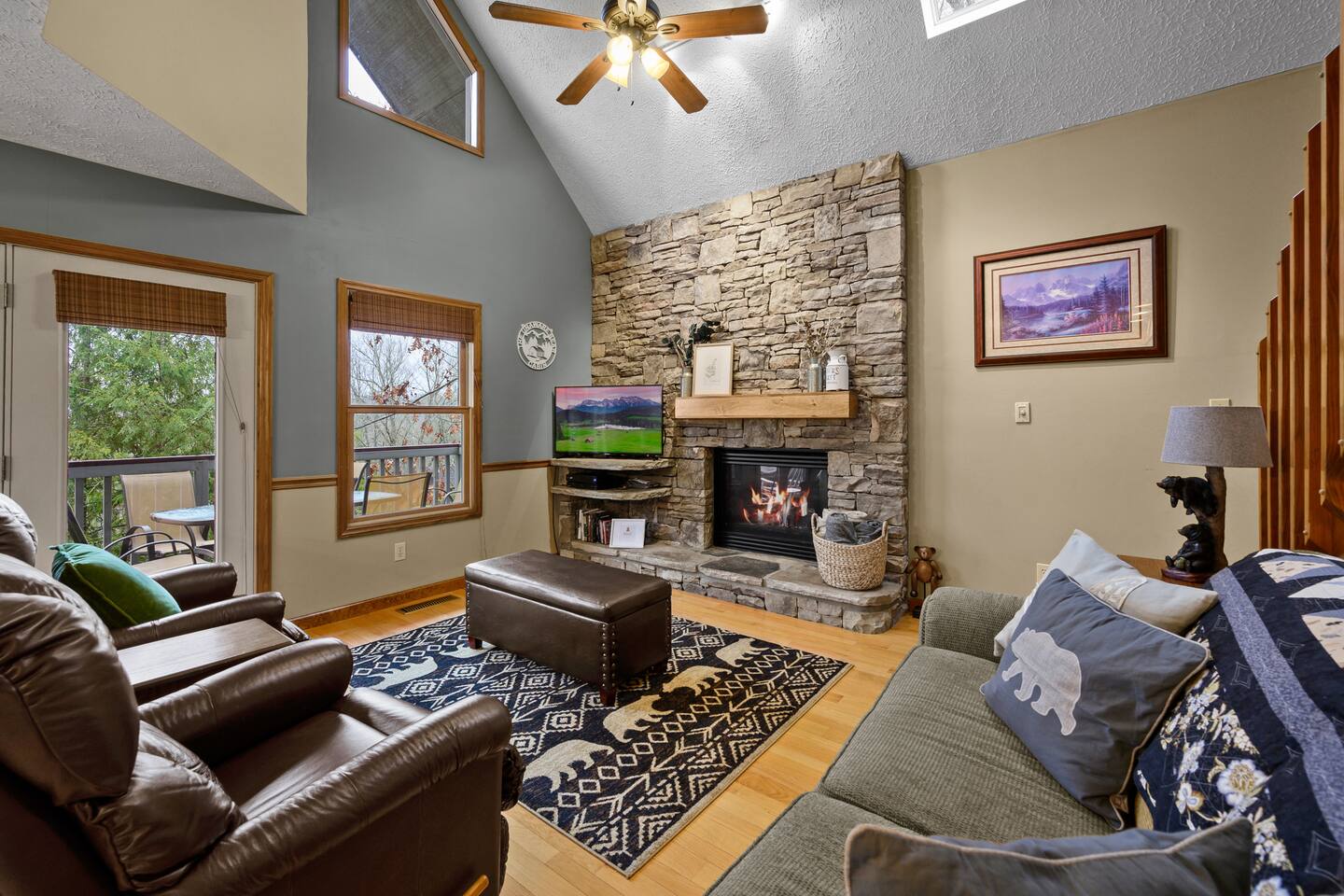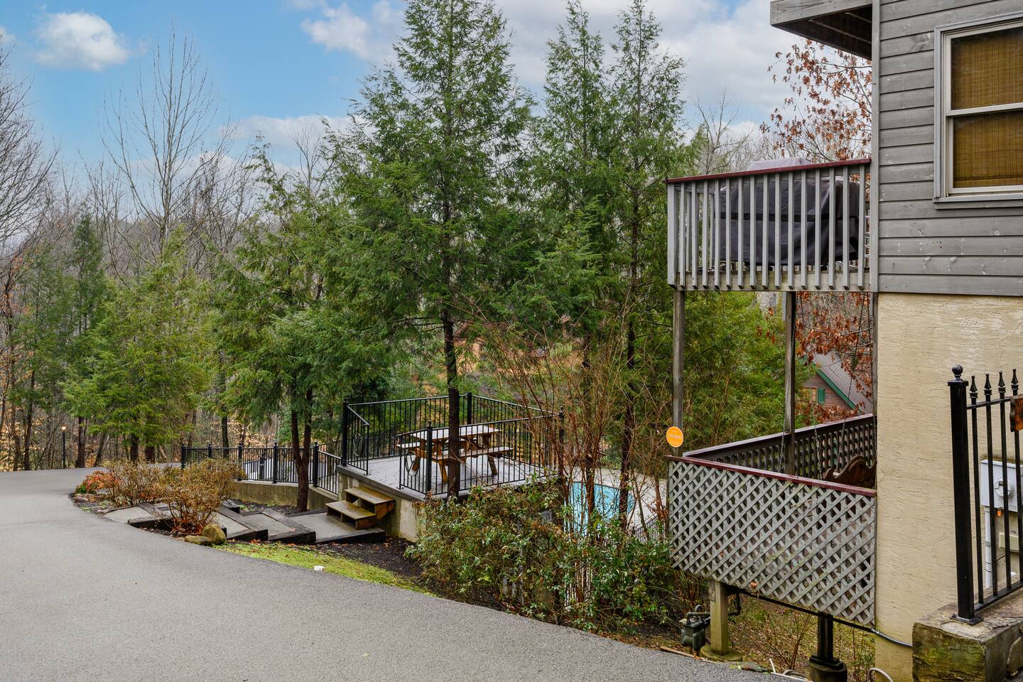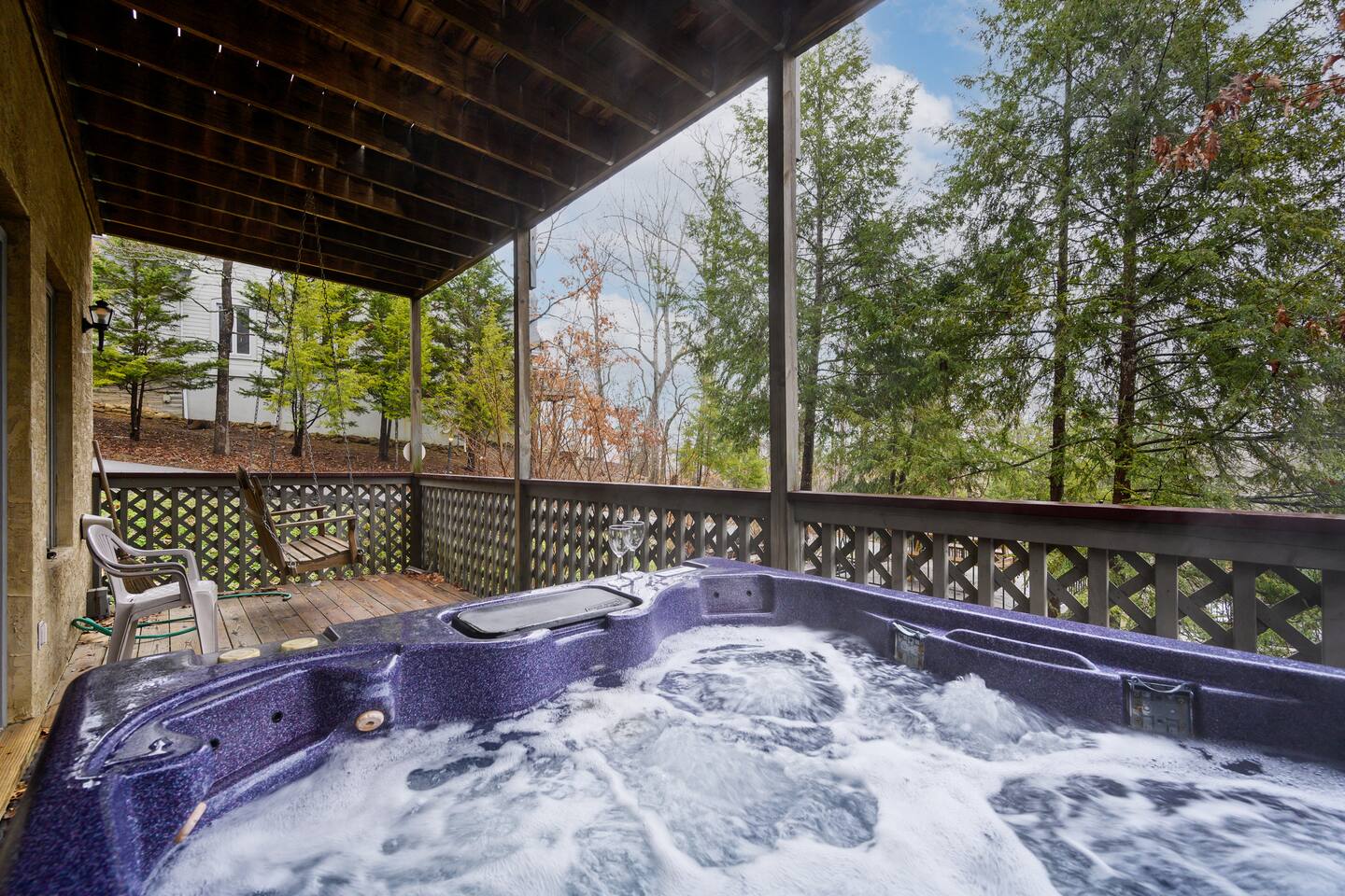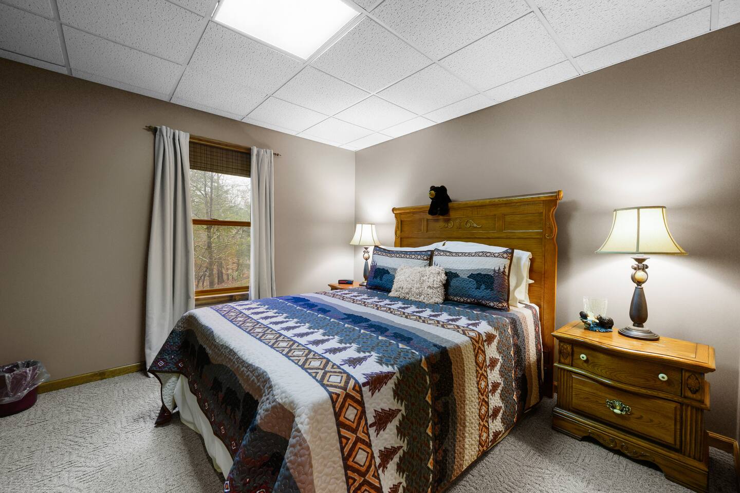New Smart TV’s in 3 of the 4 Bedrooms Master Bedroom: King Bed Bedroom 2: Queen Bed Bedroom 3 (Bunk Room): Twin-over- Twin Bunk Bed and Single Twin Bed Bedroom 4: Queen Bed We also provide a twin trundle bed and pack and play. Arrive at your cabin and take in the beauty of the surrounding trees and gorgeous pool just off the back of the house. Step inside to admire the bear-themed décor. Cathedral ceilings, long-view windows and open layout, make the place bright and airy so you can easily stay connected with your loved ones while enjoying the surrounding scenery! Gather in the living room on the leather chairs which sits in front of the gas stone fireplace, choose a movie to play for the group on the flat-screen smart TV equipped to access Netflix, Hulu, Disney+, or Amazon prime account. For more entertainment, try to beat the high score on one of our three arcades! Stay Connected with your friends and family by snapping a pictures throughout your stay. Tag us on social media to receive discounts on your stay. Hungry? Make your way into the fully equipped kitchen, featuring granite countertops with new appliances, and prepare a delicious home-cooked meal for your friends and family. Savor your meals from the charming dining room table and share stories of the day’s adventures. We even have a booster seat for children and camping themed dishes for kids. After you’ve cleared the dishes, enjoy some fresh air and sip a nightcap from the hand crafted wooden love seat porch swing on the deck while keeping an eye out for wildlife. Before calling it a night, soothe your muscles in the hot tub so you aren’t sore for the next day’s activities. As the day comes to an end, retreat to one of the 4 themed bedrooms which all feature custom sheets and comforters for a good night’s sleep. Additional features: • High speed Internet • Large deck area • Private Hot tub • Game area • Washer and dryer • Clean towels and bed linens • Flat driveway large enough for 3 cars