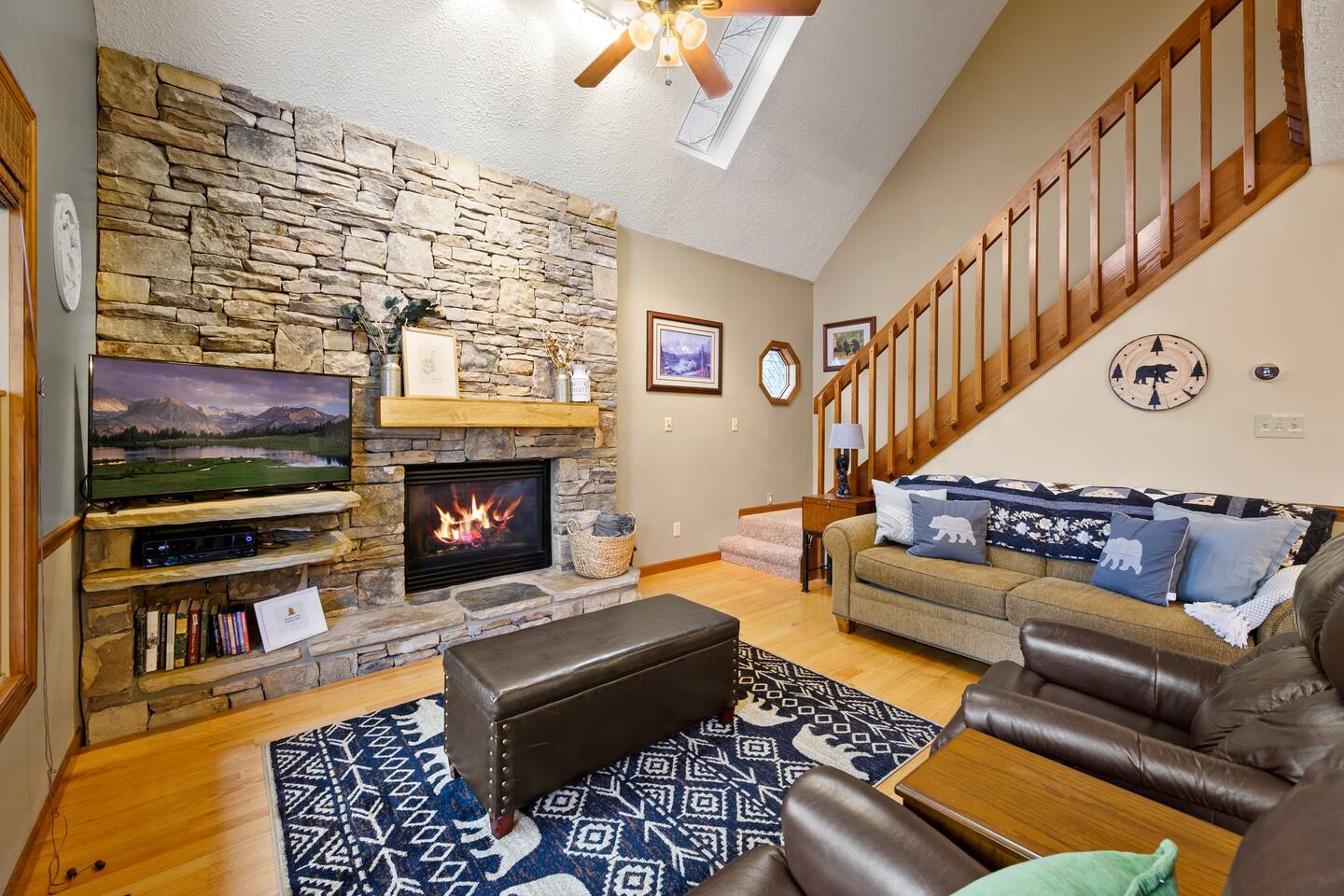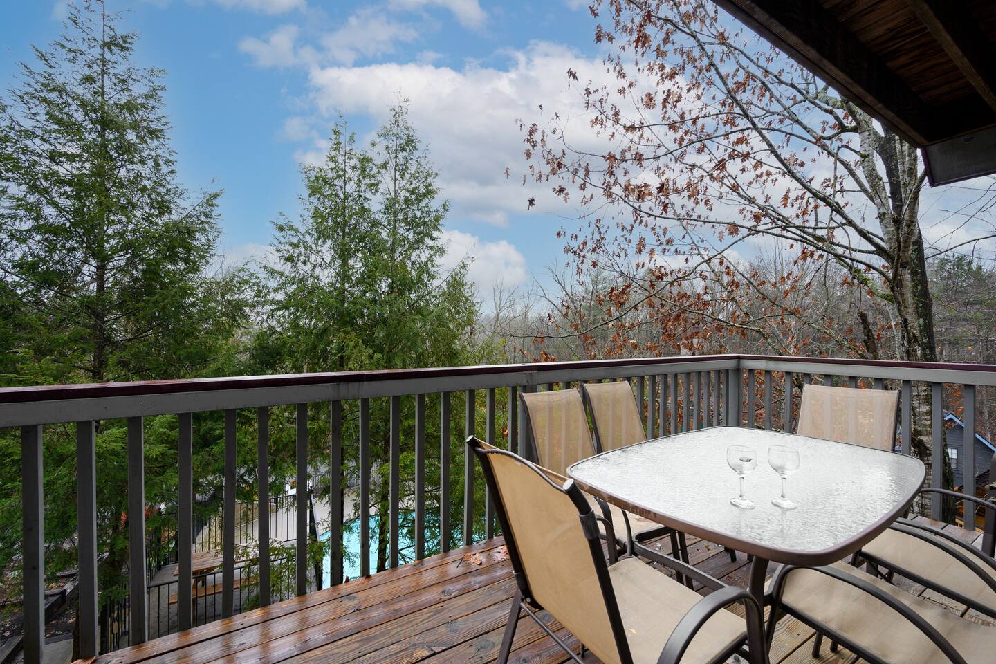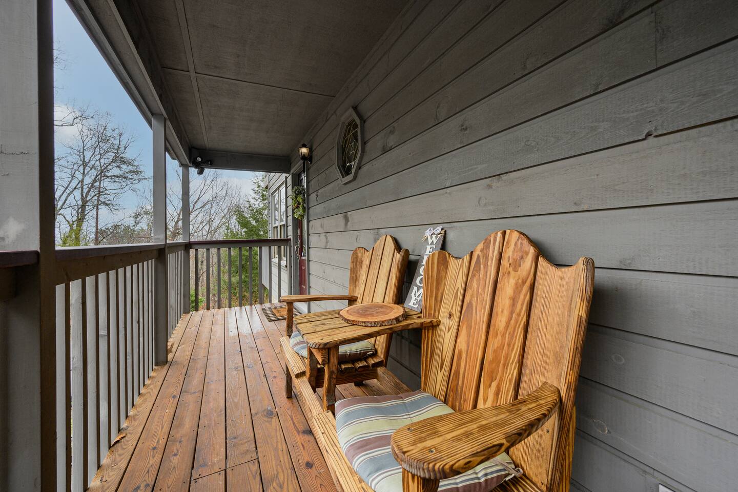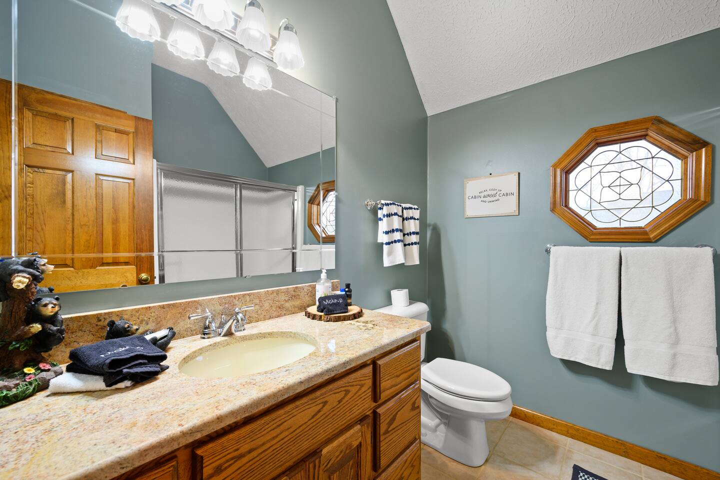 New Smart TV’s in 3 of the 4 Bedrooms Master Bedroom: King Bed Bedroom 2: Queen Bed Bedroom 3 (Bunk Room): Twin-over- Twin Bunk Bed and Single Twin Bed Bedroom 4: Queen Bed We also provide a twin trundle bed and pack and play. Arrive at your cabin and take in the beauty of the surrounding trees and gorgeous pool just off the back of the house. Step inside to admire the bear-themed décor. Cathedral ceilings, long-view windows and open layout, make the place bright and airy so you can easily stay connected with your loved ones while enjoying the surrounding scenery! Gather in the living room on the leather chairs which sits in front of the gas stone fireplace, choose a movie to play for the group on the flat-screen smart TV equipped to access Netflix, Hulu, Disney+, or Amazon prime account. For more entertainment, try to beat the high score on one of our three arcades! Stay Connected with your friends and family by snapping a pictures throughout your stay. Tag us on social media to receive discounts on your stay. Hungry? Make your way into the fully equipped kitchen, featuring granite countertops with new appliances, and prepare a delicious home-cooked meal for your friends and family. Savor your meals from the charming dining room table and share stories of the day’s adventures. We even have a booster seat for children and camping themed dishes for kids. After you’ve cleared the dishes, enjoy some fresh air and sip a nightcap from the hand crafted wooden love seat porch swing on the deck while keeping an eye out for wildlife. Before calling it a night, soothe your muscles in the hot tub so you aren’t sore for the next day’s activities. As the day comes to an end, retreat to one of the 4 themed bedrooms which all feature custom sheets and comforters for a good night’s sleep. Additional features: • High speed Internet • Large deck area • Private Hot tub • Game area • Washer and dryer • Clean towels and bed linens • Flat driveway large enough for 3 cars